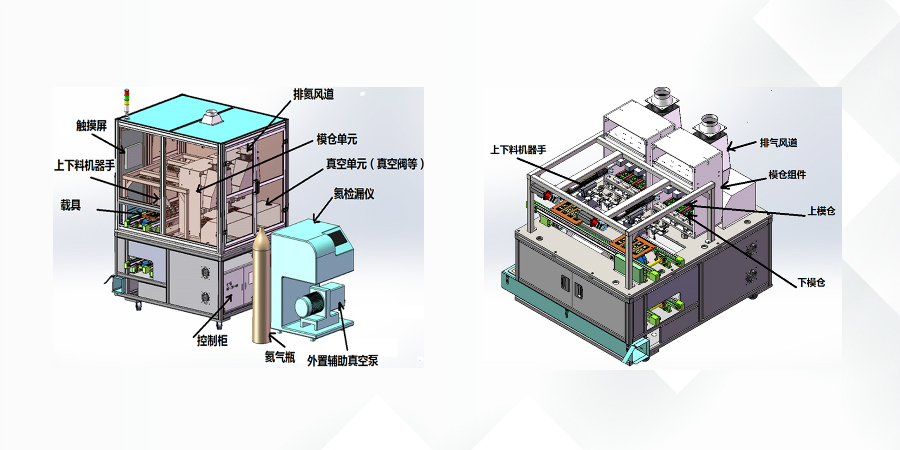 靈帕的自動(dòng)化氦檢漏系統(tǒng)由自動(dòng)進(jìn)/出料系統(tǒng)、真空箱、密封空間的真空獲得和檢測、過程控制、數(shù)據(jù)記錄和存儲(chǔ)等系統(tǒng)組成。自動(dòng)進(jìn)料系統(tǒng)將被測工件穩(wěn)妥地放入預(yù)設(shè)的密封夾具中,繼而形成密封空間,通過檢測密閉空間內(nèi)的氦泄漏率判斷工件的氣密性。全程程序控制。工件包括:  電池蓋板、電池外殼、冷卻管路等組件。