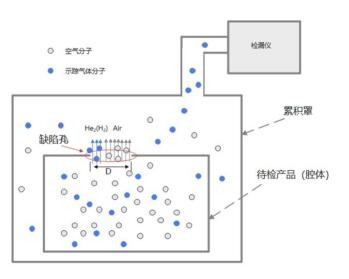 將充滿氦氣的被測工件置于一個密閉的常壓(一個大氣壓)累積腔體中,被測工件內部氣壓略高于大氣壓,在 常壓累積腔體上接氦質譜檢漏儀,如果工件有泄露,則在其外的常壓累積腔體中氦分子的濃度就會升高。為了提高檢測的精度和一致性,需要讓泄露的氦氣”累積”一定的時間,并在常壓累積腔體內需要布置適量的混氣裝置(如:風扇),使得泄露的氦氣在常壓腔體內各個位置的濃度盡量均勻。通過檢測常壓累積腔體內氦濃度的變化就可以推斷被測工件的泄露情況,這就是氦氣常壓累積法。